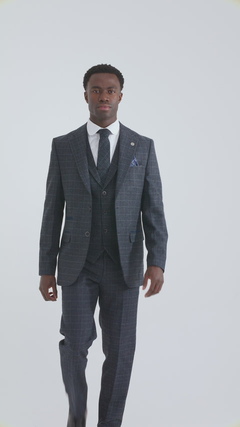 - Tweed Blue Prince Of Wales Navy Check Suit Finished In Wool Feel Premium Soft Fabric With a Turn-Down Collar Waistcoat