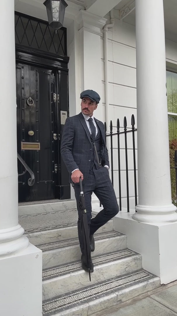 Men's 3 Piece Suit Wool Tweed Navy Blue Brown Check 1920s Gatsby
