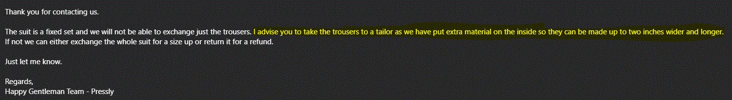 If your suit is a fixed set with a standard 6-inch drop between the jacket and trousers, and you find the trousers slightly too tight or loose, don't worry. All our trousers are designed with extra material in the waistband, allowing them to be easily adjusted by 1.5-2 inches by any local tailor or dry cleaner. This quick and affordable alteration typically takes 10-20 minutes.